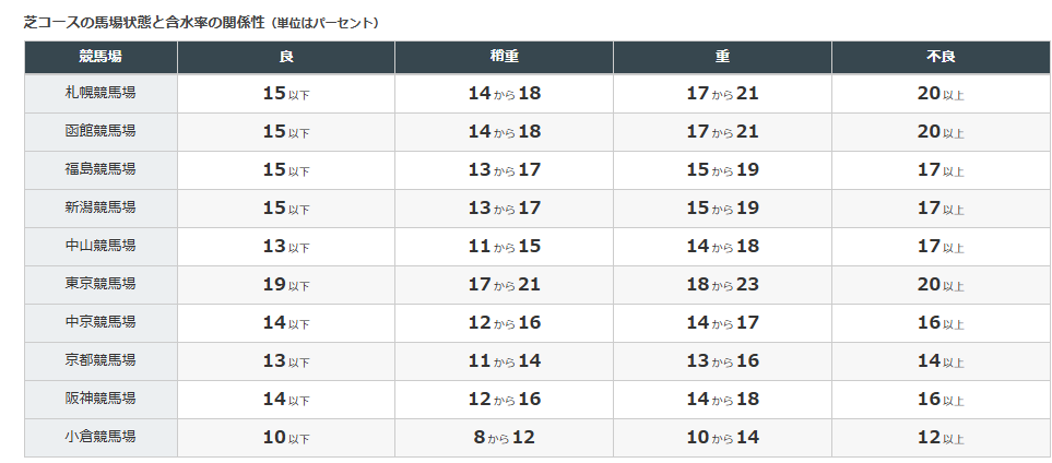 上の図はJRAが公式に発表している芝コースの「馬場状態の定義」です。一見して東京競馬場だけが目立ちますよね。他の競馬場で不良馬場と判断される数値でも、府中では良馬場なのです。そして良馬場でなければ、稍重、重の定義から外れさえしなければ不良馬場と発表しても差し支えないことになります。この事実を私はつい先日まで確認していませんでした。