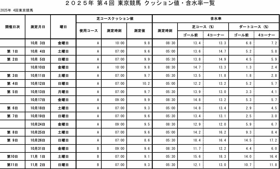 こうなっちゃうと重馬場の得手不得手とかどうでもよくなりますよね。馬柱を見る上でのファクターの一つを真っ向から否定するようなものですから。水さえ浮いてなければ見ても判りませんし。なので今秋も4回東京9日ではダートは不良でも芝は稍重止まりでした。重馬場というには4コーナーの数値が足りていない。